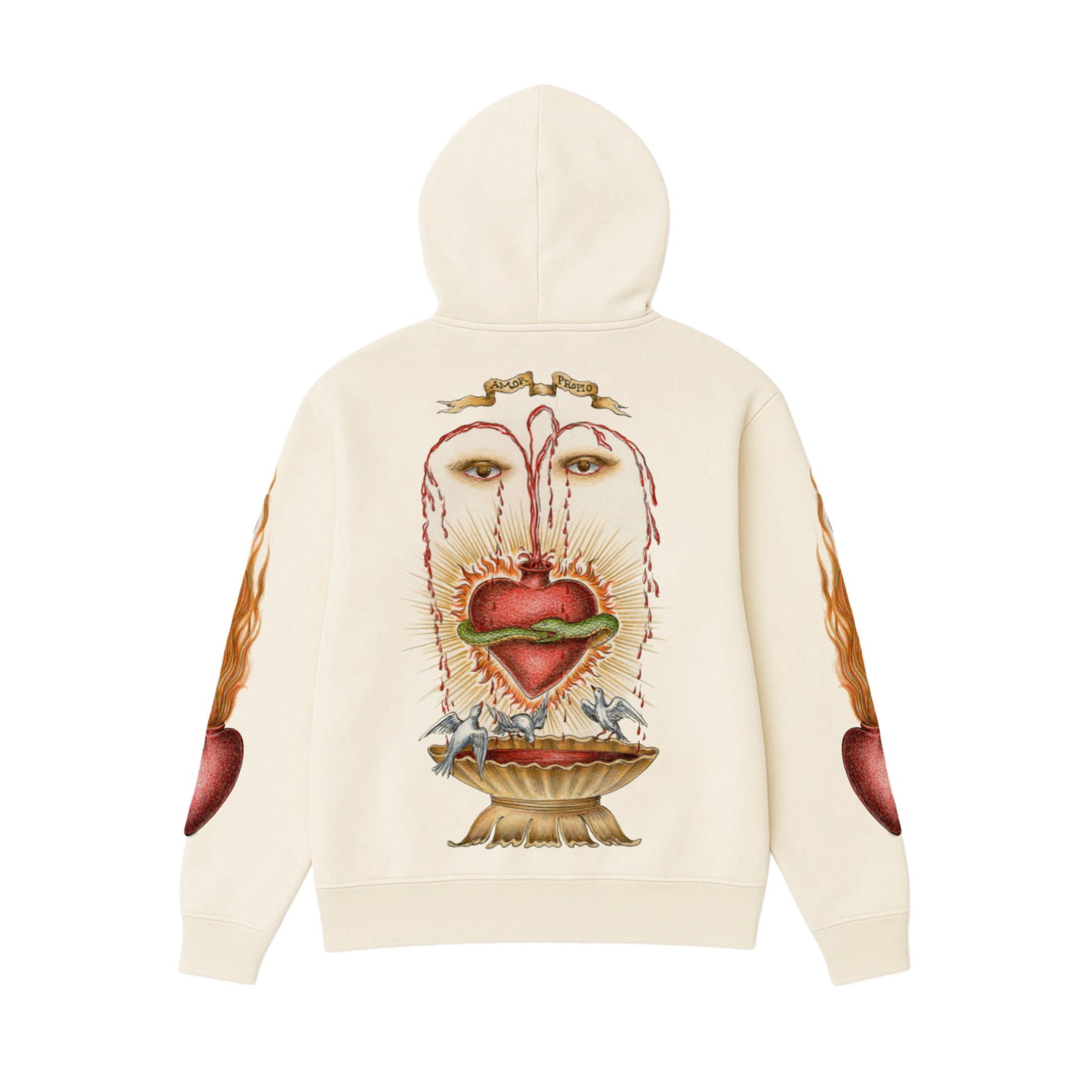 Premium 12oz cream hoodie, with artwork screen printed on the front, sleeves & back. This hoodie runs true to size.