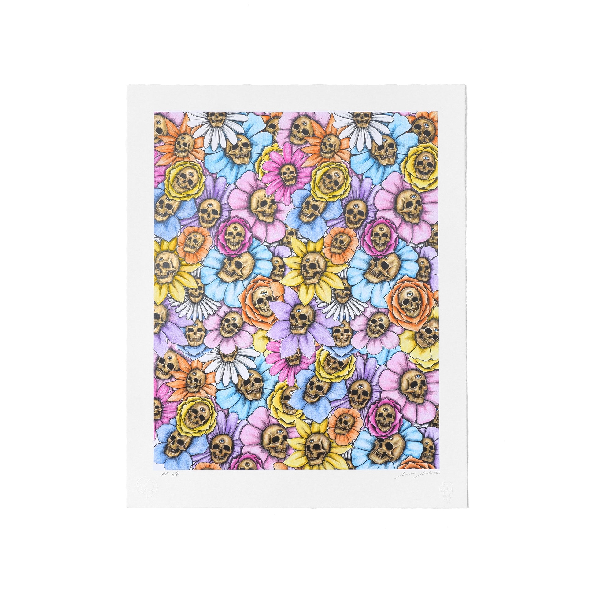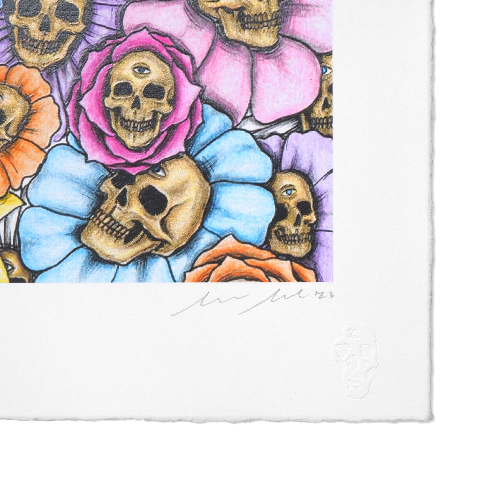 This archival limited edition print is printed in Los Angeles with archival pigment & 2 serigraphic touch plates, with “Skull” emboss lower left, & hand-deckled edges.